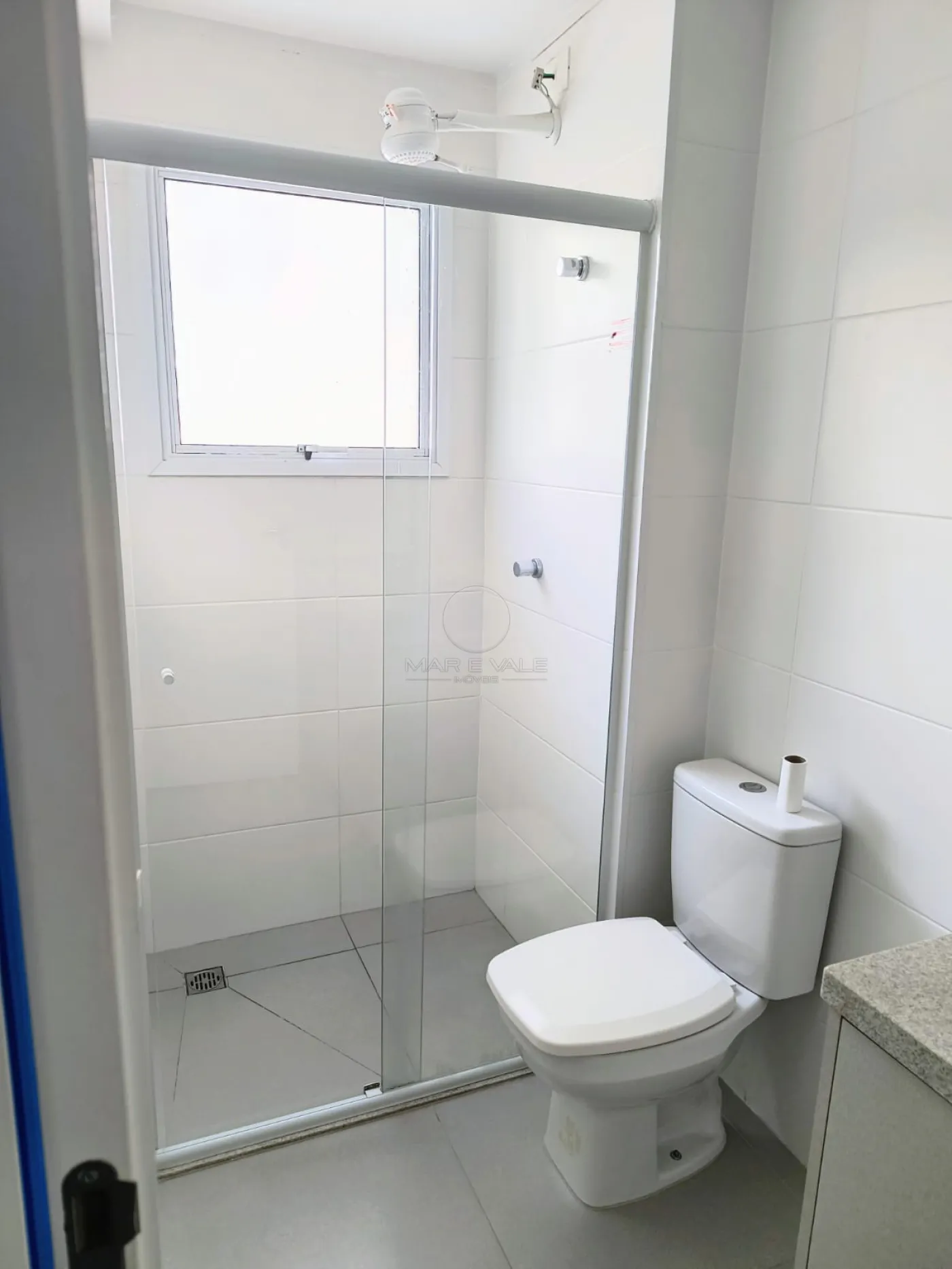 - Banheiro com gabinete, box blindex e chuveiro instalado