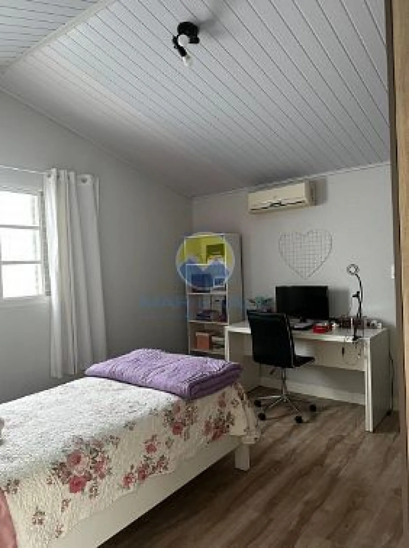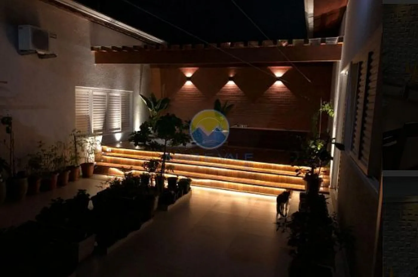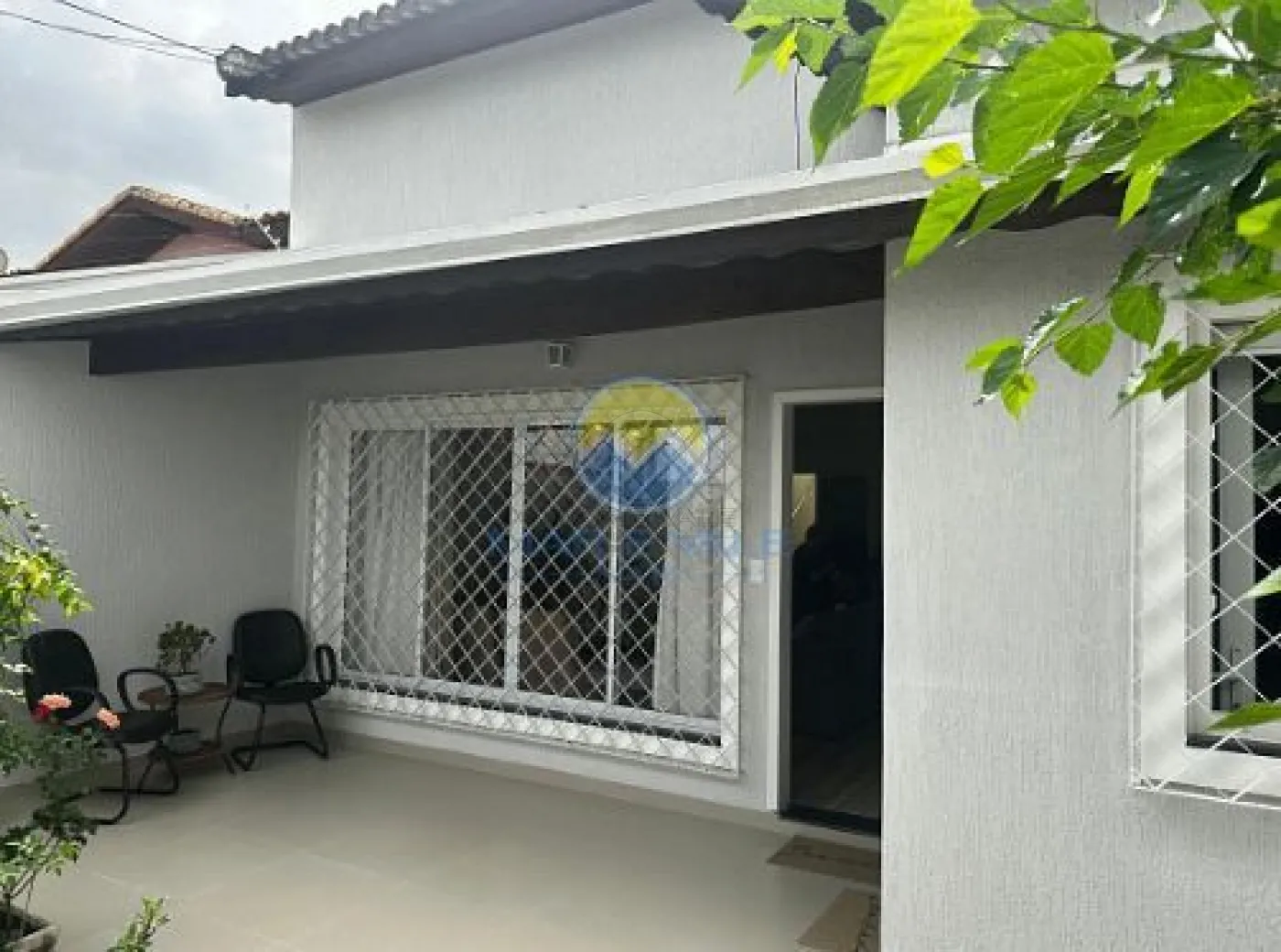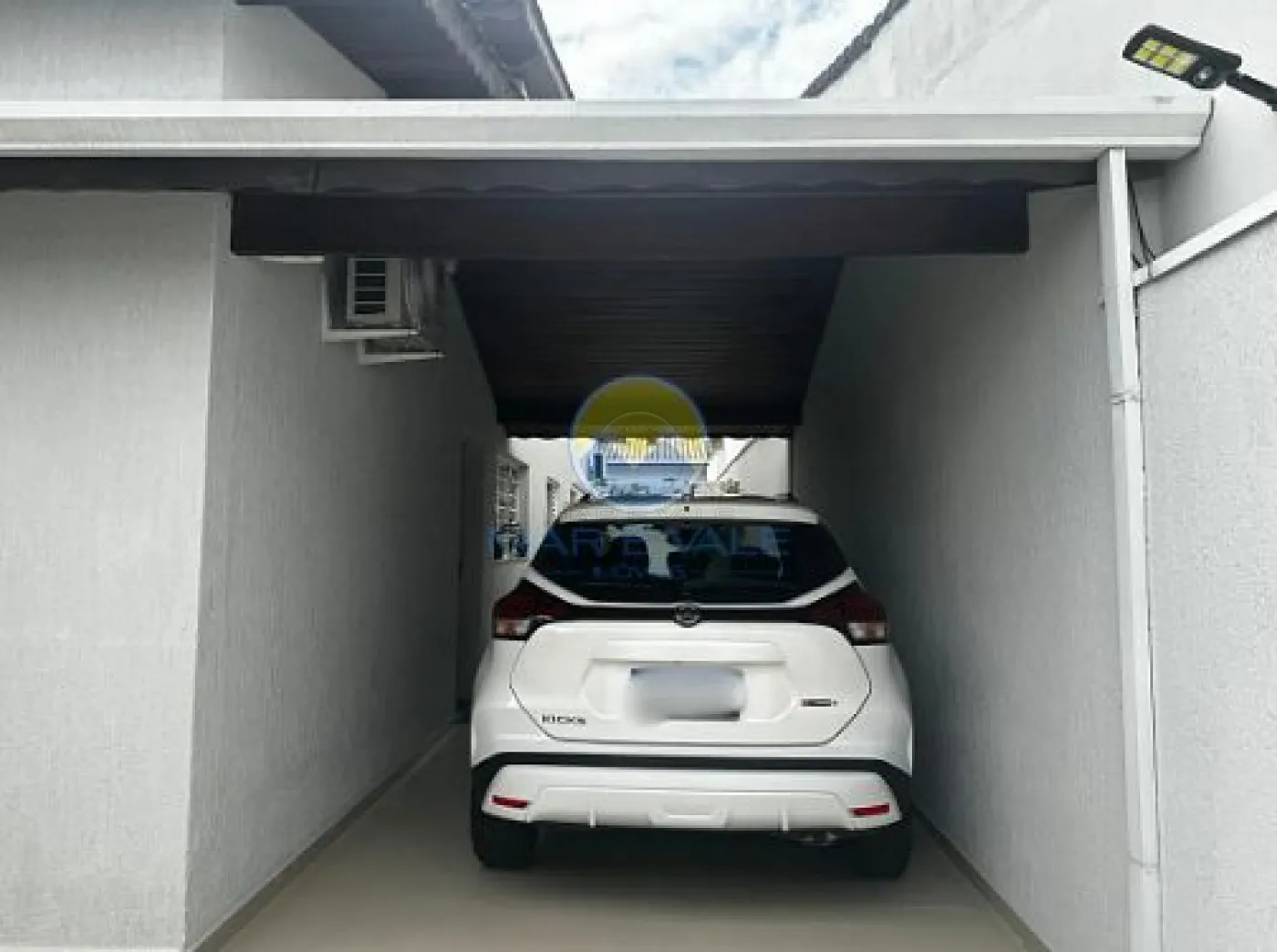 No piso superior, encontram-se dois dormitórios, ambos com ar-condicionado, e um banheiro social. Há ainda amplos espaços de depósito no sótão. A fachada é moderna, com iluminação exclusiva, e o imóvel conta com portão automatizado, cerca elétrica e garagem com capacidade para dois até três veículos.