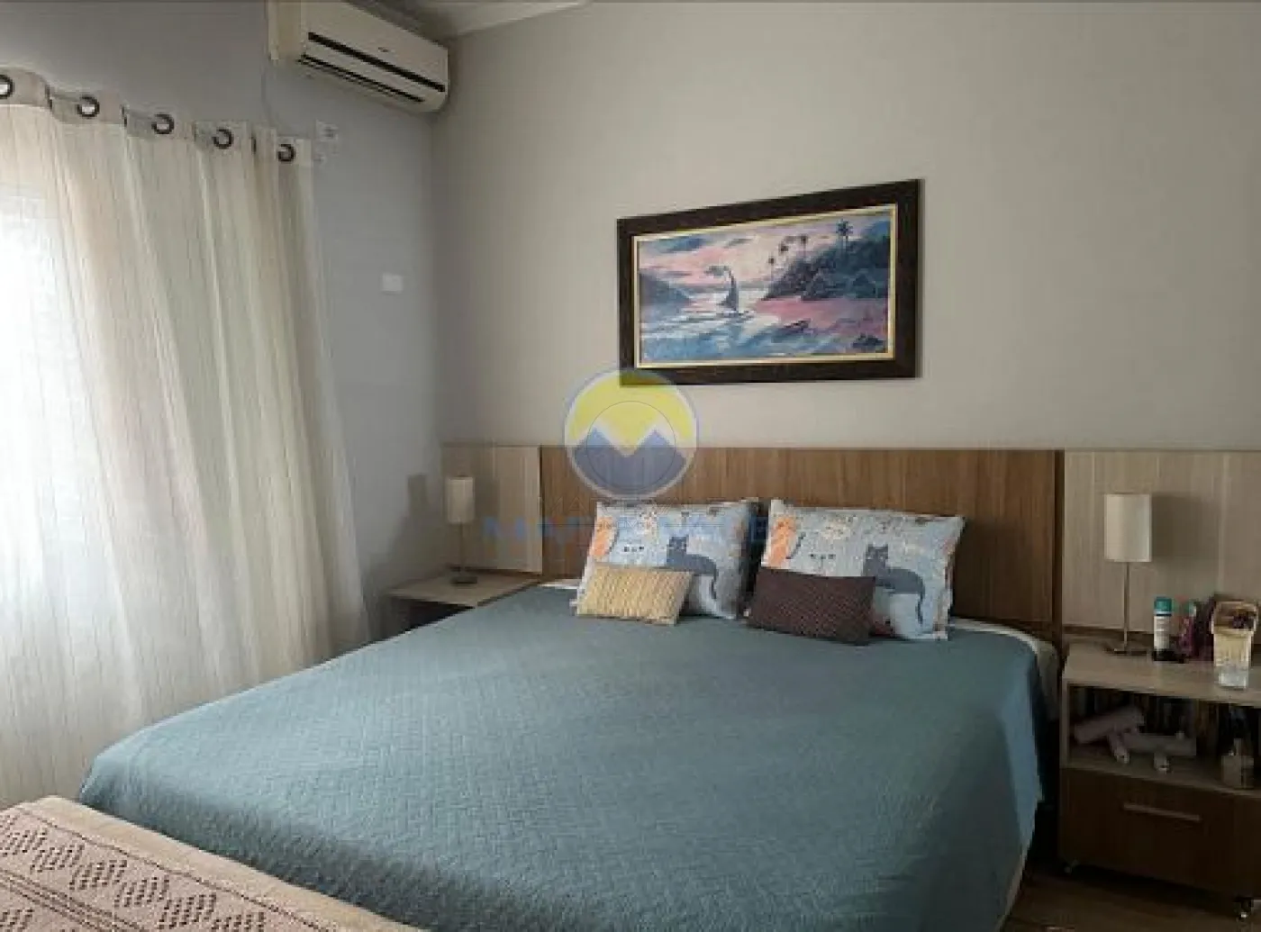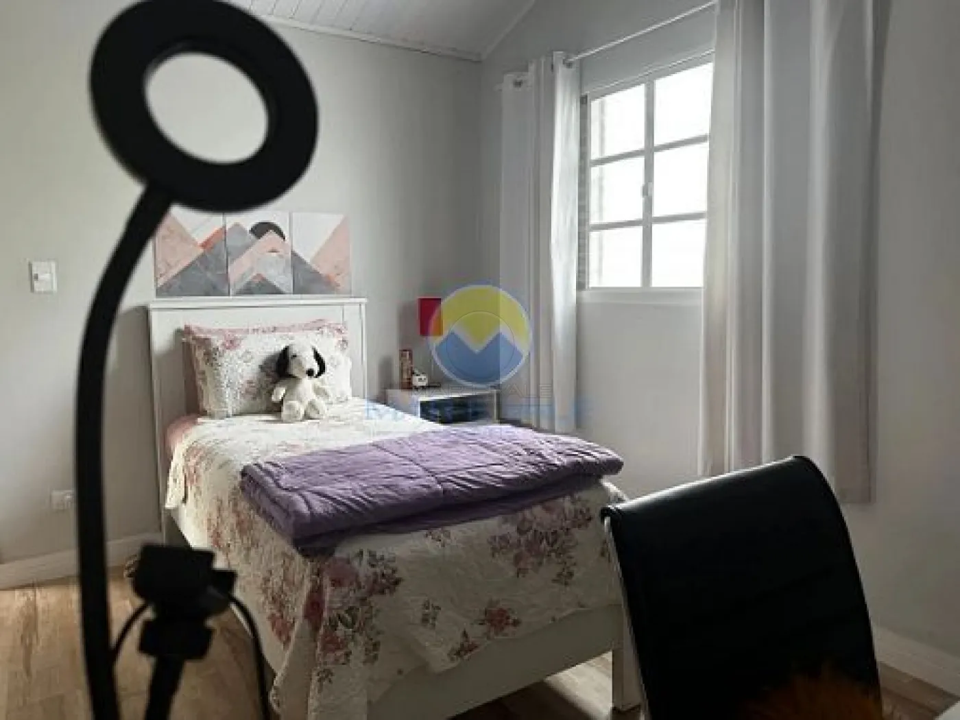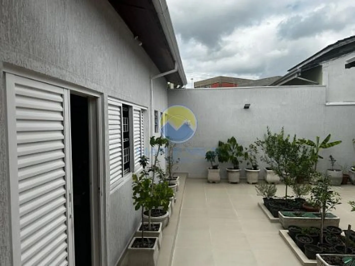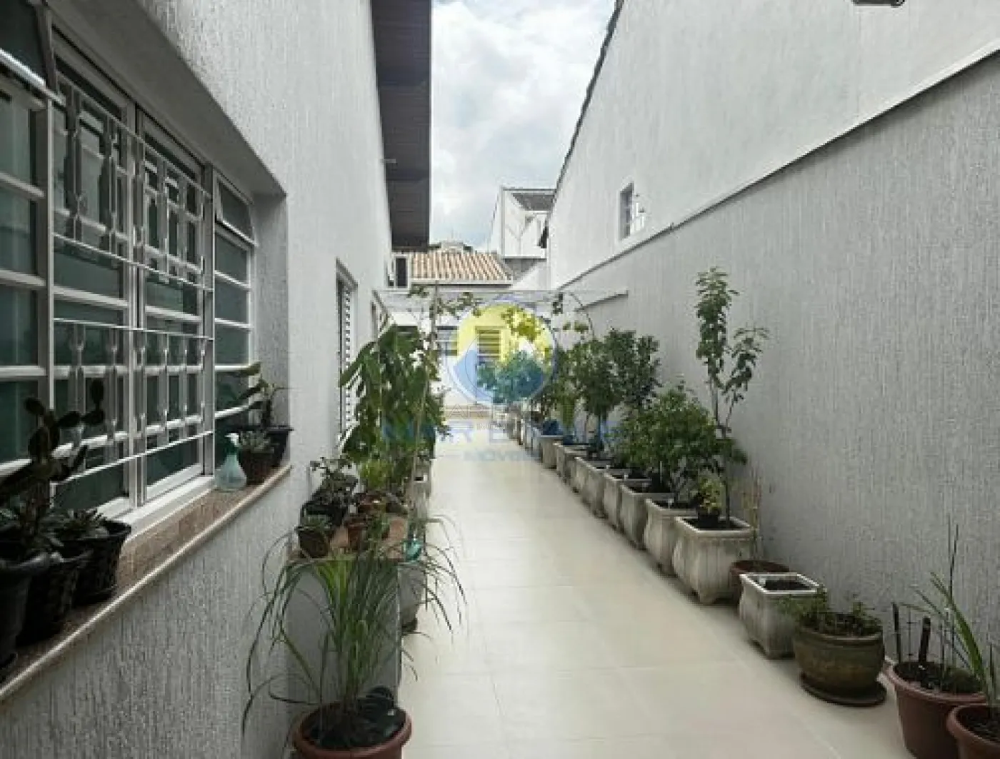 No piso superior, encontram-se dois dormitórios, ambos com ar-condicionado, e um banheiro social. Há ainda amplos espaços de depósito no sótão. A fachada é moderna, com iluminação exclusiva, e o imóvel conta com portão automatizado, cerca elétrica e garagem com capacidade para dois até três veículos.