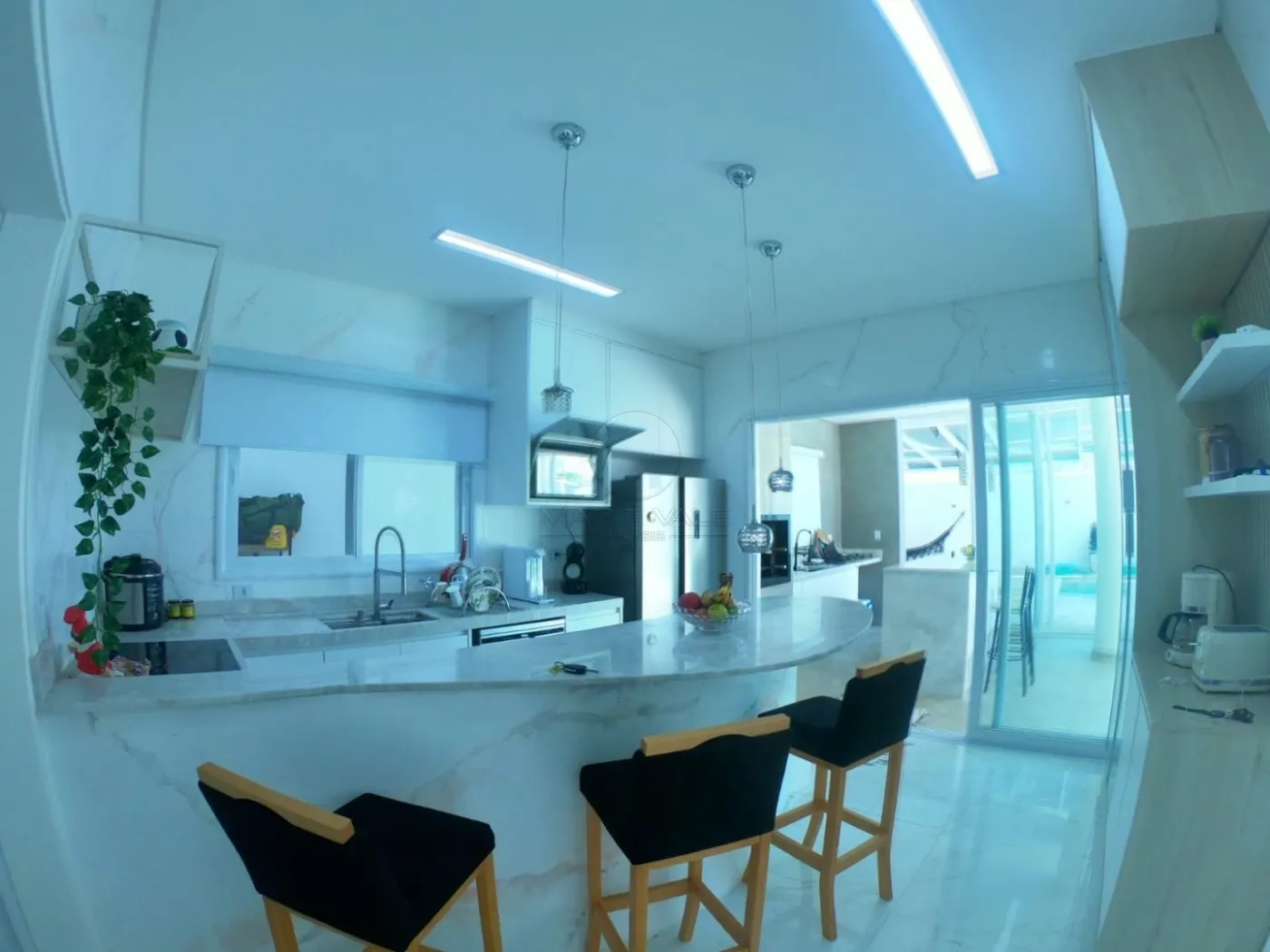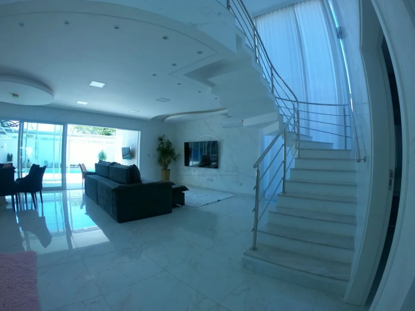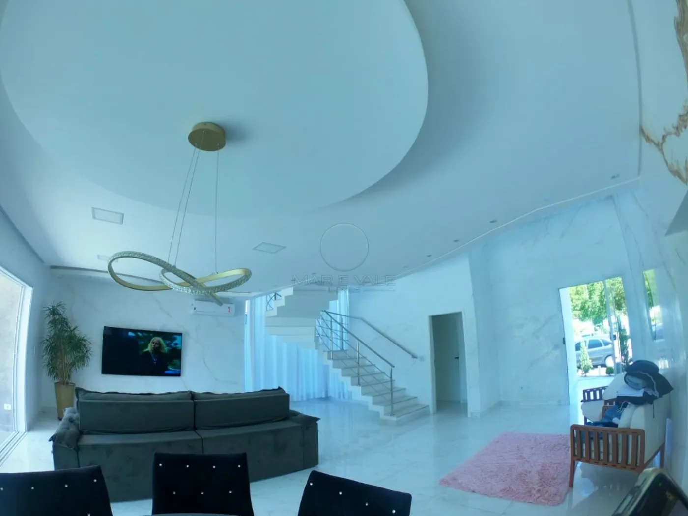 - Sala com pé direito duplo, integrada a cozinha e área gourmet