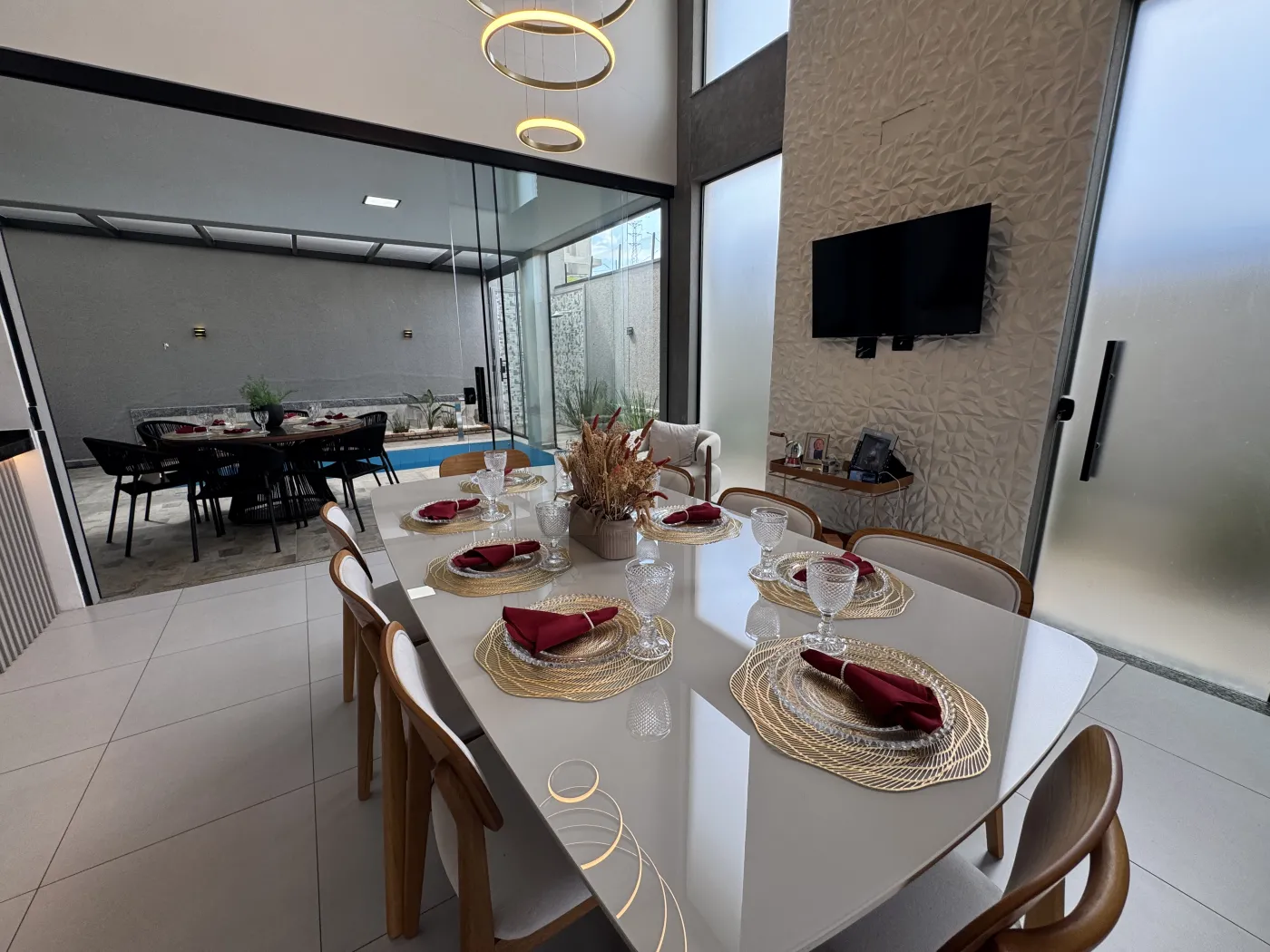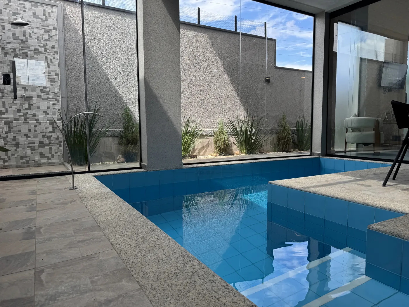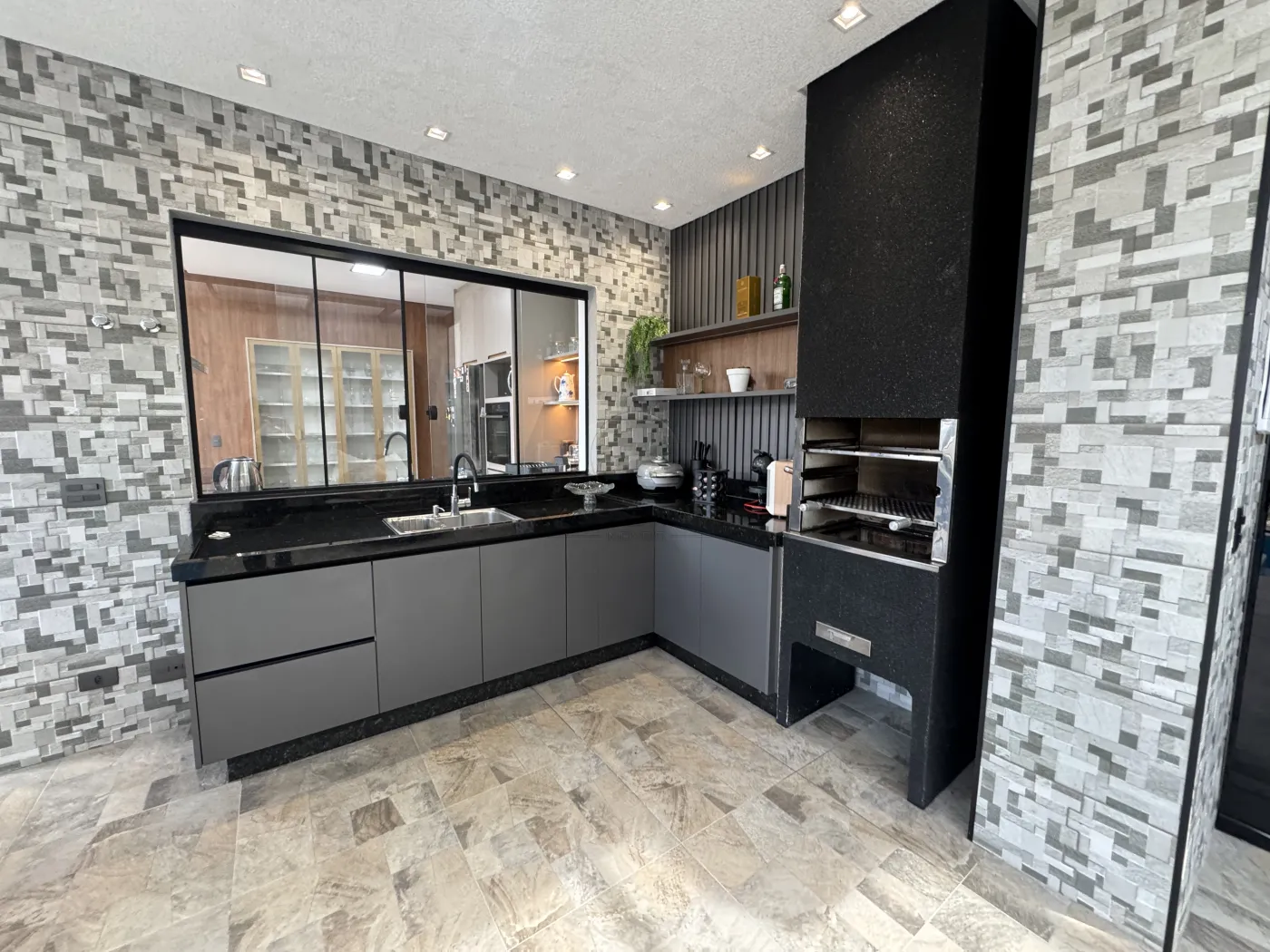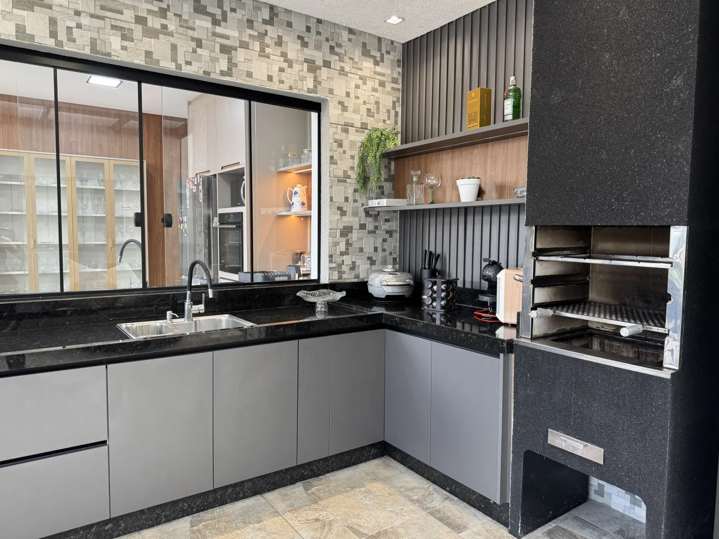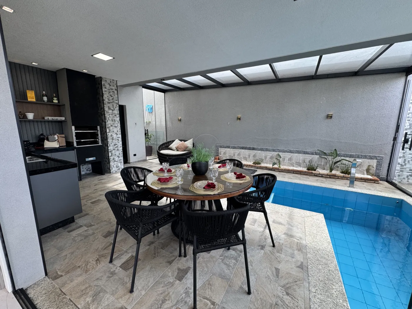 - Área gourmet com churrasqueira, pergolado em vidro e banheiro de apoio