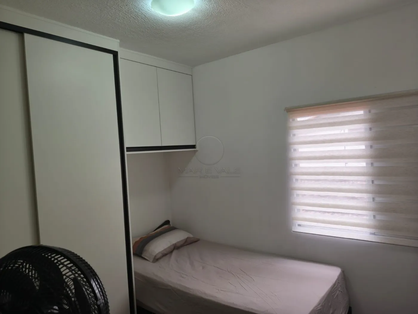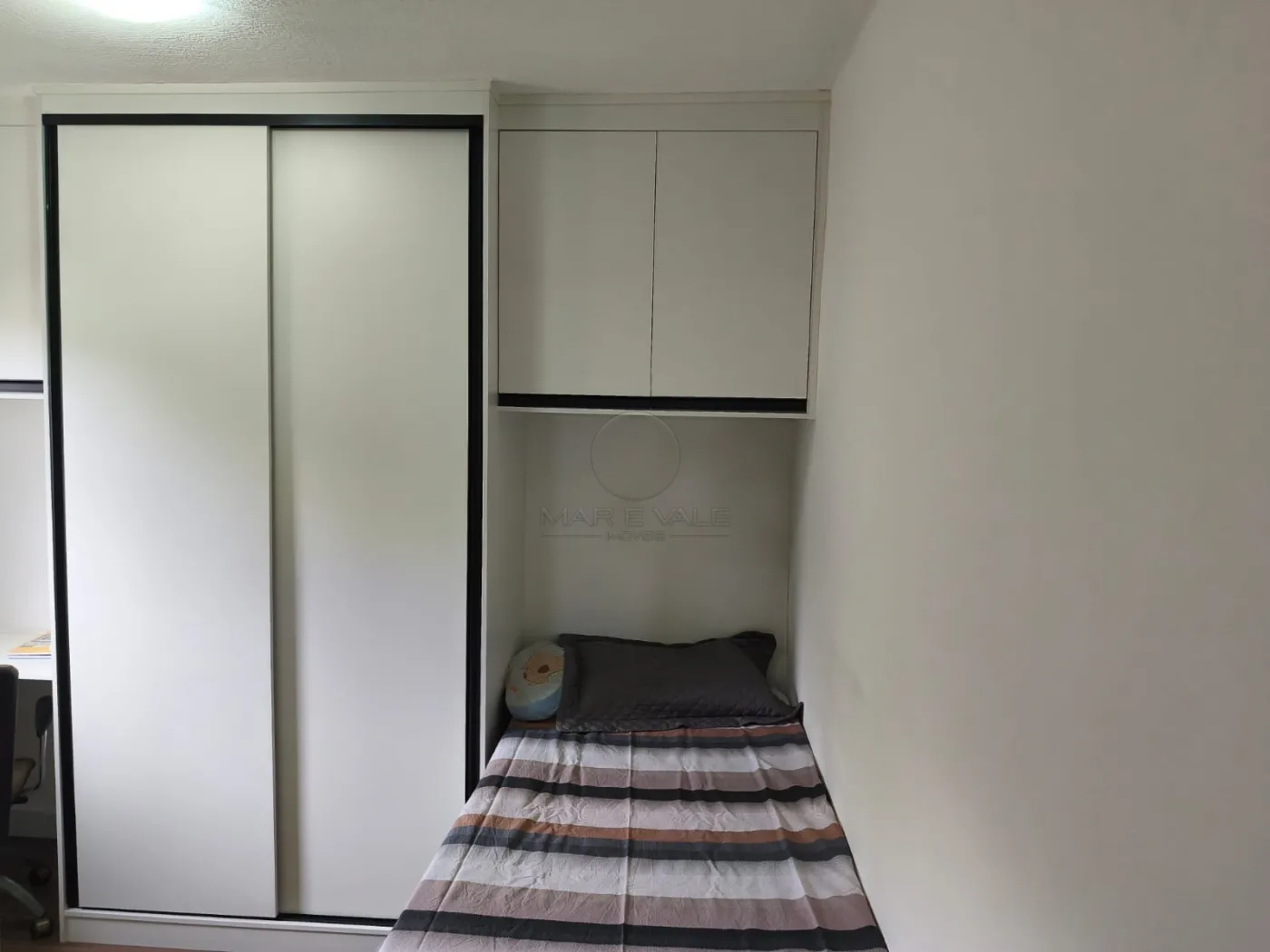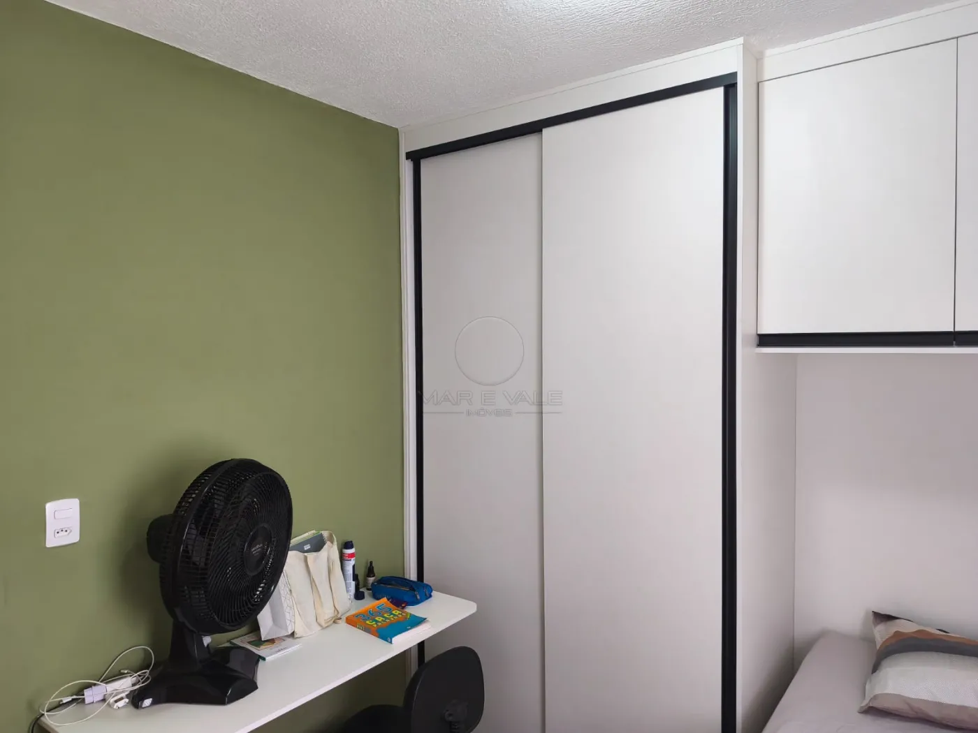O segundo quarto também possui piso vinílico e conta com sacada com peitoril em vidro, proporcionando modernidade e estilo ao ambiente. A porta-balcão em alumínio da linha Gold na cor preta complementa o visual, com persiana automatizada integrada.